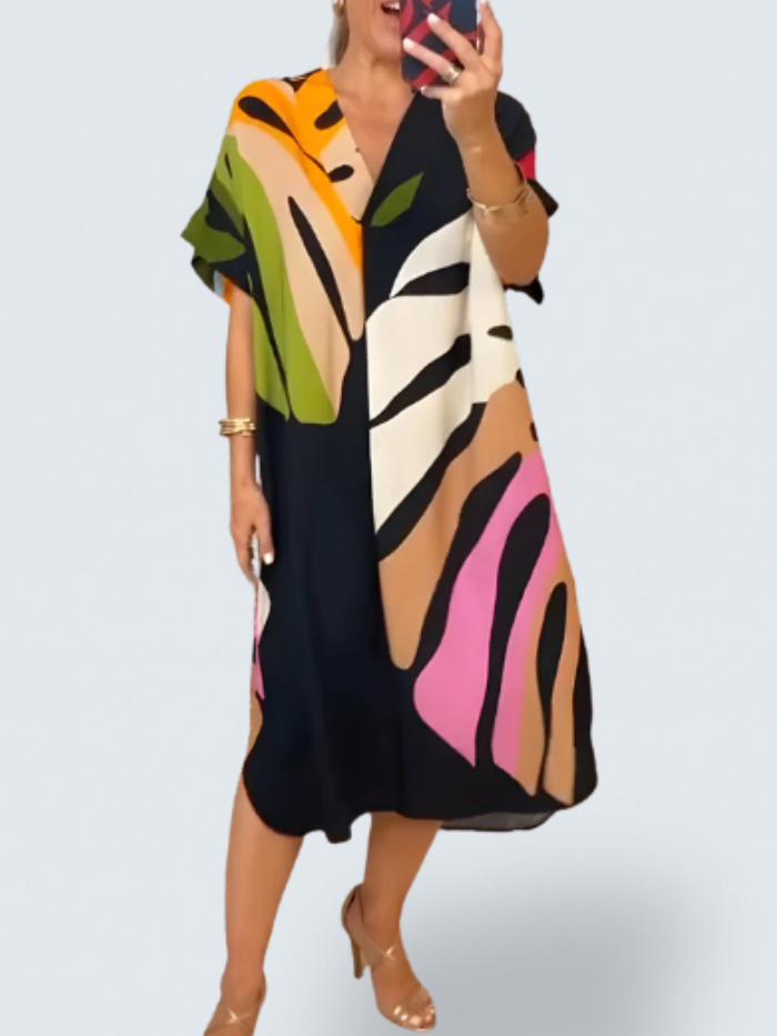 Step into the sunny season with this elegant dress, adorned with a playful leaf print. The lightweight, soft fabric keeps you comfortable from morning to night, whether you're enjoying a leisurely stroll or relaxing on a terrace. With its effortless style and exceptional comfort, this dress is a true summer wardrobe essential.
