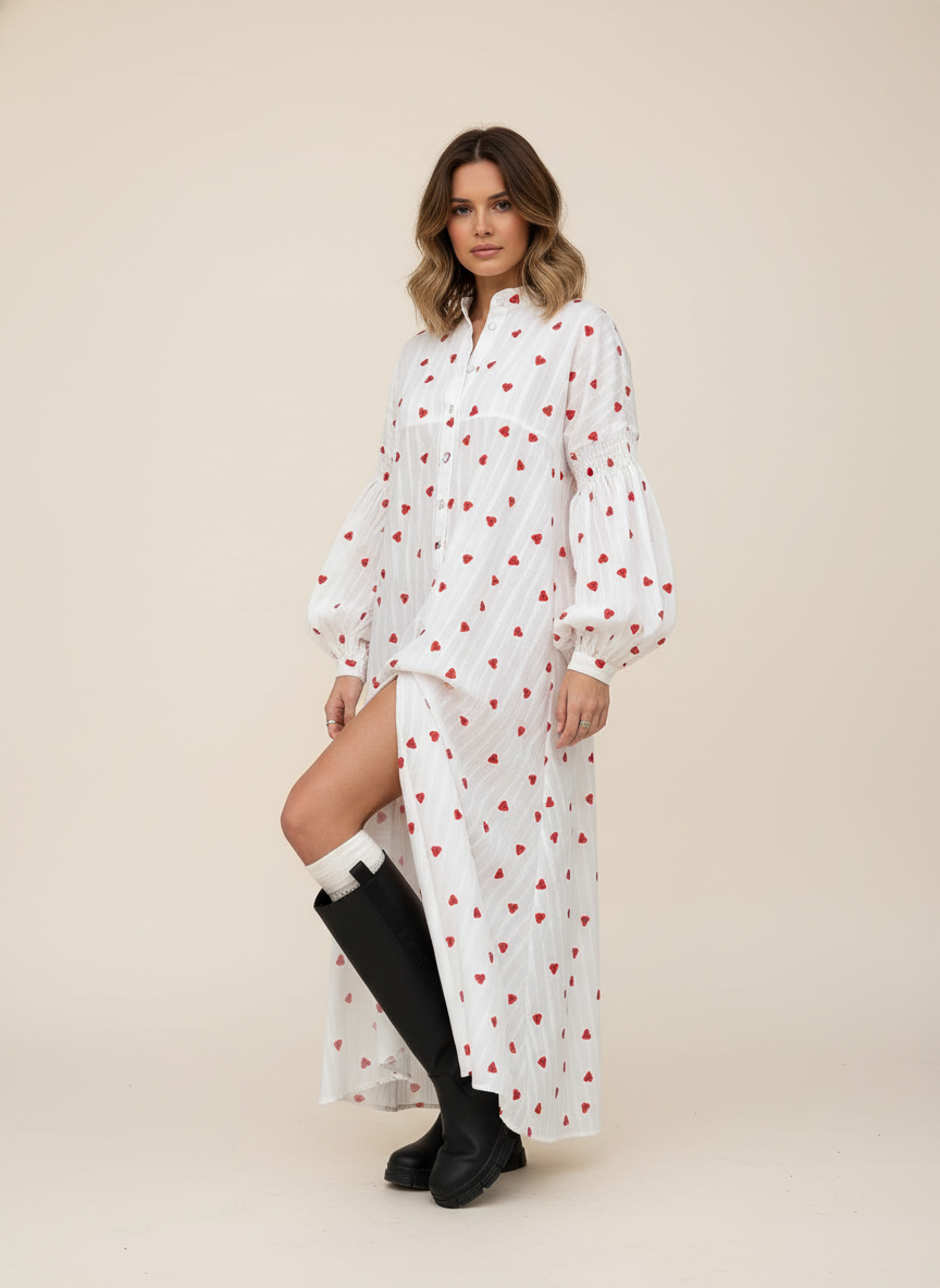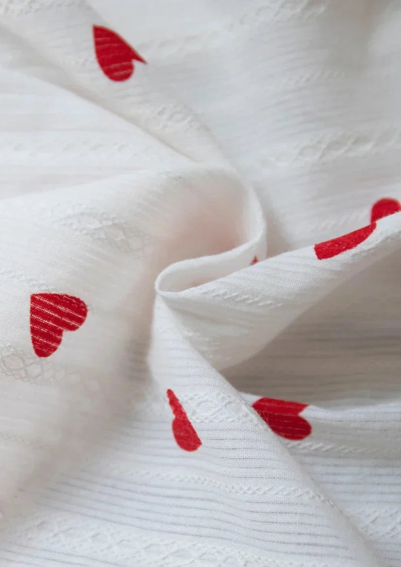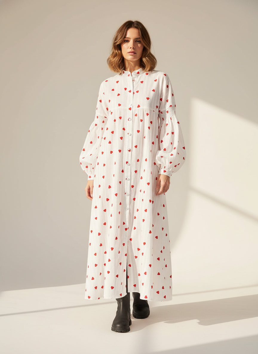 Crafted from pure textured jacquard cotton, Ophelia is delicately adorned with bold red hearts throughout. The balloon sleeves, with a slight elastic cinch at the upper arm, create an exaggerated feminine silhouette. This dress features a cotton lining that extends below the bust, an ankle-to-maxi length (depending on your height), a full skirt, and front buttons for closure.